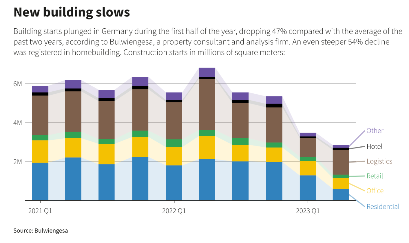 In the latest signs of stress in the sector, Germany's largest real estate group, Vonovia (VNAn.DE), posted multi-billion euro losses and writedowns, and job growth for construction workers has stagnated. New construction plummeted in Germany during the first half of the year, dropping 47% compared with the average of the past two years, and new building permits plunged 27% during the first five months.