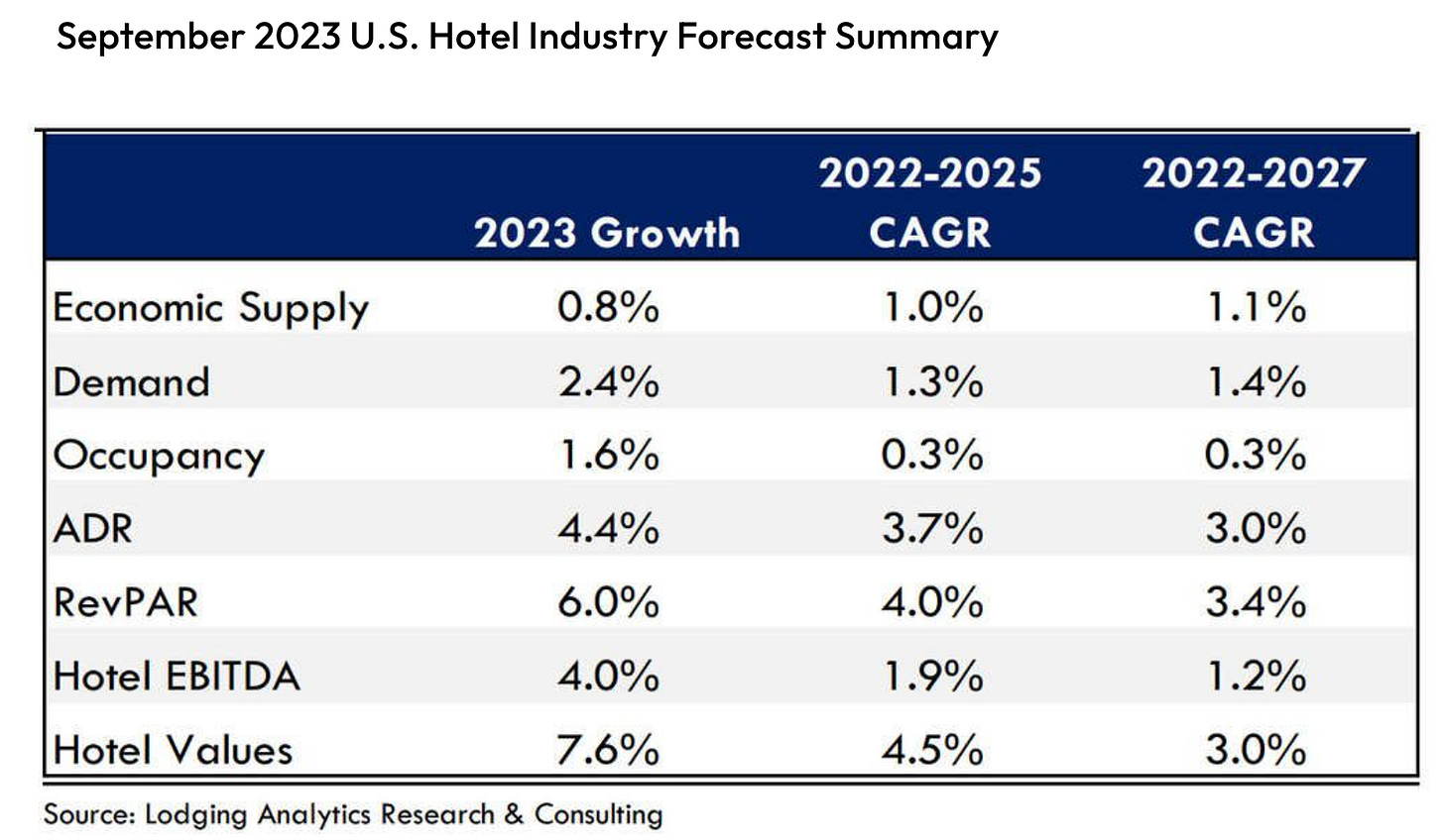Notwithstanding the recent (but expected) deceleration in U.S. RevPAR growth, America’s lodging industry performance remains vibrant. Although Lodging Analytics Research & Consulting’s (LARC) forecast is modestly altered for 2023 and beyond, the overall outlook continues to be encouraging.