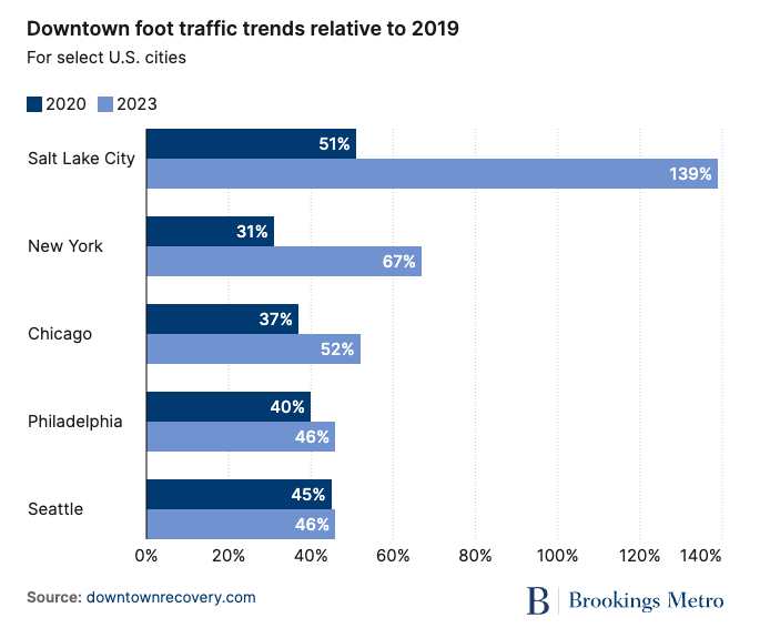 Recent research from the University of Toronto and UC Berkeley shows that Salt Lake City has recovered the highest percentage of unique visitors to its downtown relative to 2019. The chart below shows the city’s “recovery ranking” compared to New York, Chicago, Philadelphia, and Seattle—downtown areas that Brookings Metro has been charting as part of a research project on the future of downtowns.