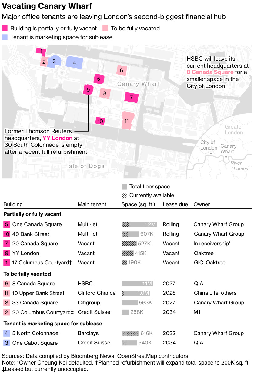 HSBC’s plan to leave its Canary Wharf tower for a smaller site shows the global challenges ahead in repurposing unwanted office space for a post-pandemic world. The building’s fortunes are changing — much for the worse — with the bank relocating in 2027 after more than two decades in the Norman Foster-designed tower. Its new home will be a space roughly half the size in the City of London. And other major office tenants are leaving London’s second-biggest financial hub. Learn more here.