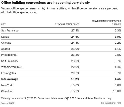 Most major cities have about 20 percent of their office space vacant and only about 2 percent currently undergoing a conversion, according to real estate firm CBRE. Cities need a conversion boom to help cut vacancy rates in half, a level that would stabilize property markets and re-create a feeling of pre-pandemic vibrancy. Right now, the ' financial and architectural challenges of converting offices to residences are too often prohibitive.