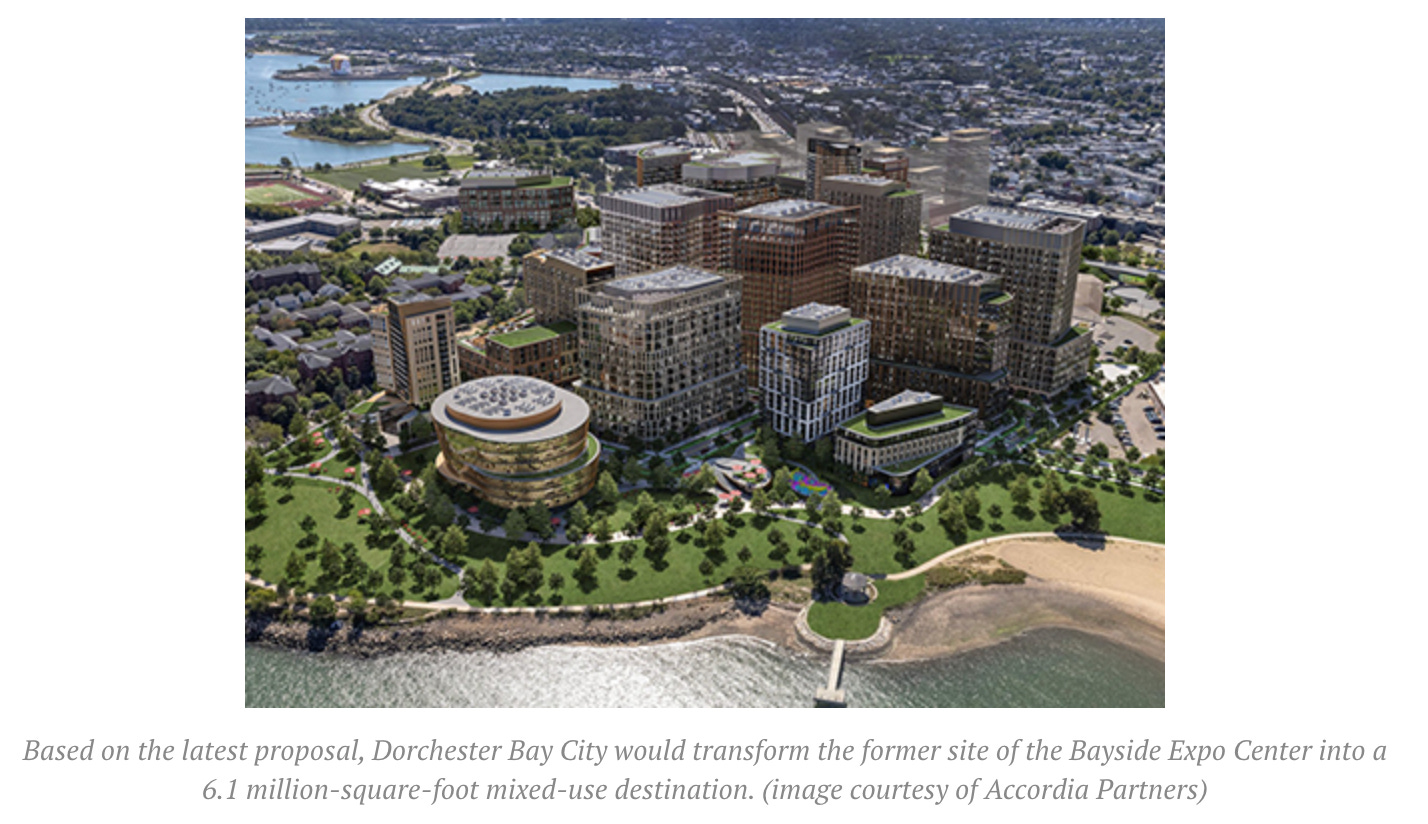 The Boston Planning & Development Agency has approved the master plan of Dorchester Bay City, a mixed-use project on the city’s south side. The waterfront project is a redevelopment of the former site of the Bayside Expo Center. Accordia Partners leads the development team, a partnership between Boston developers Kirk Sykes and Dick Galvin and New York-based Ares Capital Corp.