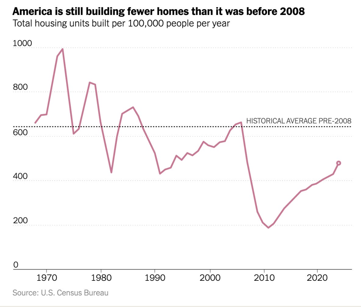 That housing chart really shows the scale of the shortage. We're not even close to pre-2008 levels per capita, which explains a lot about why affordability keeps getting worse. Would be interesting to see regional breakdowns though, since some metros are building more than others.